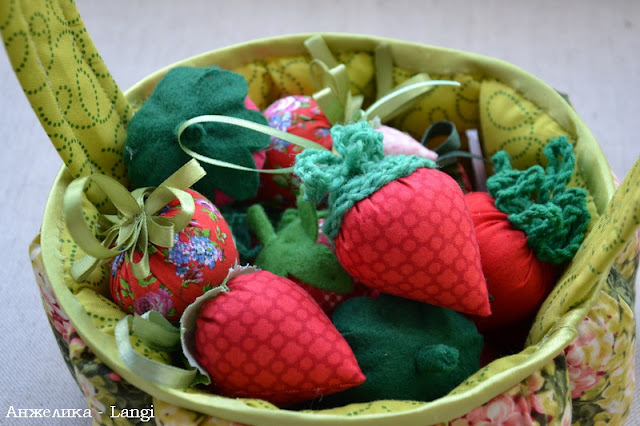 Ягодки в лукошке попадались разные. Какие-то уже поспели, а какие -то были еще зеленые. Но ароматными были все))) Я тоже решила обыграть ягодки по разному, поэтому какие-то ягодки имеют хвостики их пряжи, какие-то вышиты, у кого-то хвостик из фетра. В общем, моем лукошке угощение на любой вкус!)))