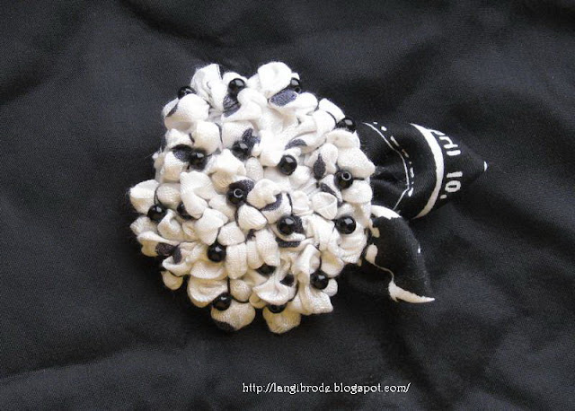 Пока сидела и сшивала корзинку, по телевизору шла передача для женщин и там рассказывали про комоно(именно О). Это японский вид творчества, когда из старого кимоно делали другие изделия. Ведь само кимоно шьется из очень качественной ткани и стоит дорого. И вот одно из направлений -это изготовление  брошей. Я внимательно посмотрела и сделала себе парочку))) Лоскутки для них нужны не меньше 30 на 30